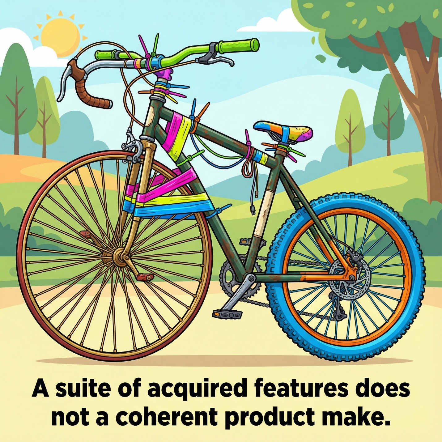 The bicycle built from mismatched parts is every technology portfolio that grew through opportunistic addition rather than strategic design. The front wheel spins differently than the back. The gears don’t match the chain. Every component works individually. Nothing works together. And the rider—your customer—is left trying to make sense of something that should have been designed as a system.